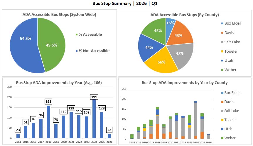 UTA will improve and build over 100 bus stops across the Wasatch Front over the next several months, including in Weber, Davis, Salt Lake, and Utah counties. Work began in September 2024 and will continue through March 2025.